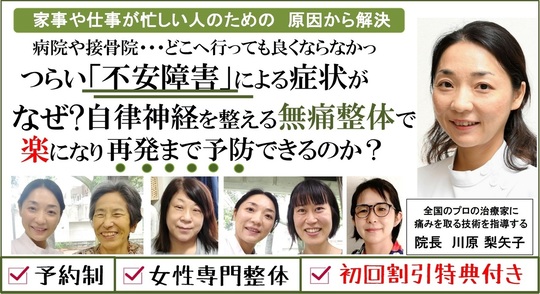 中野区沼袋の女性専門整体院|痛みと自律神経の専門家。頭痛、肩こり、腰痛、顎関節、更年期、産前産後、女性特有の慢性症状 あなたのお悩み聞かせて下さい
