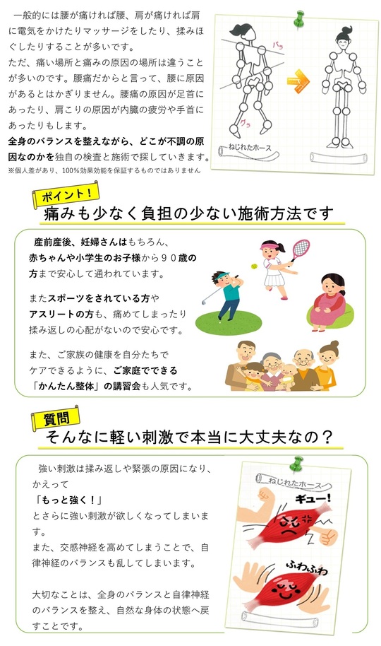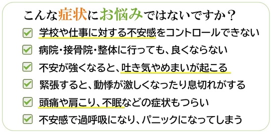 不安障害による身体症状が強く出ている場合、改善までに時間がかかることもありますが、施術だけでなく、日常生活でできる簡単なセルフケアの方法もお伝えしていきます。