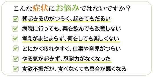 症状を改善には十分な休養と栄養状態の改善、ストレスフルな環境の見直しなど、心身両面+環境調整の総合的なアプローチが必要です。