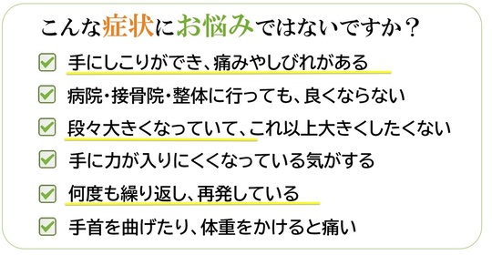 最初はコメ粒ほどの大きさで気が付かないこともありますが、手首などは、使い過ぎによってしこりがピンポン玉ぐらいの大きさになることもよくあります。