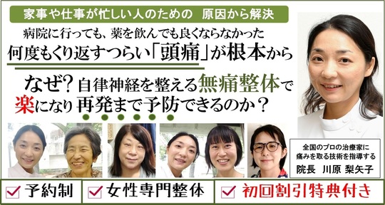 中野区沼袋の女性専門整体院|痛みと自律神経の専門家。頭痛、肩こり、腰痛、顎関節、更年期、産前産後、女性特有の慢性症状 あなたのお悩み聞かせて下さい