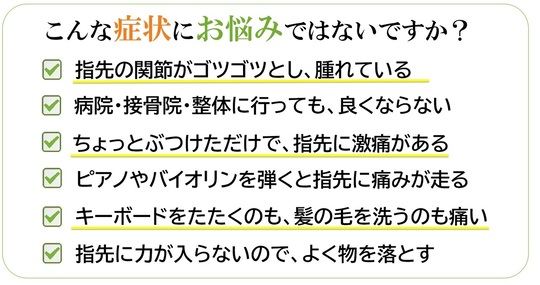 痛みや変形があると、手を人に見られることが怖くなったり、日常生活や仕事に支障が出るなど、精神面でのストレスも強くなってきます。