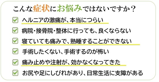 症状は腰痛や片脚の痛みが多く、馬尾型に比べ、危険度は低いとされています。