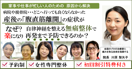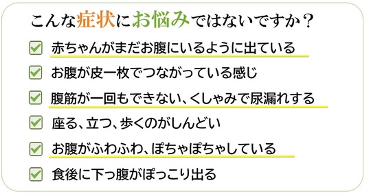 多くの場合、出産後に自然に治癒しますが、産後の疲労やストレス、骨盤や様々な箇所の歪みなどで、腹直筋が離開した状態がなかなか改善されないこともあります。