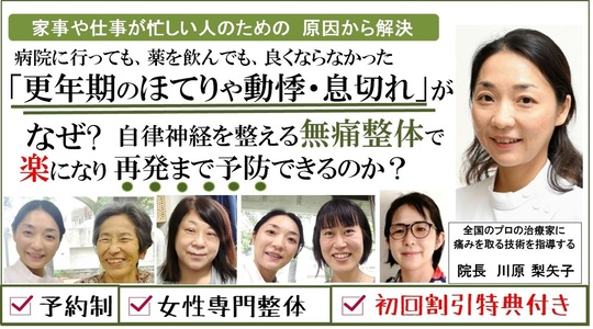 当院の無痛整体で自律神経を整えることによって、更年期障害の諸症状を緩和、改善させ、更年期のセンシティブな心身と上手に付き合い、できるだけ快適に過ごしていきませんか?