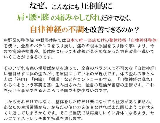 中野区沼袋の女性専門整体院|痛みと自律神経の専門家。頭痛、肩こり、腰痛、顎関節、更年期、産前産後、女性特有の慢性症状 あなたのお悩み聞かせて下さい