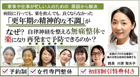 当院の無痛整体で自律神経を整えることによって、更年期障害の諸症状を緩和、改善させ、更年期のセンシティブな心身と上手に付き合い、できるだけ快適に過ごしていきませんか?