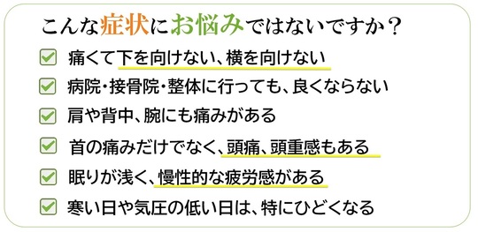 当院では、首だけをもんだり強く押したりするような施術は行いません。
