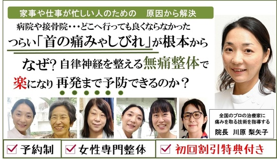 中野区沼袋の女性専門整体院|痛みと自律神経の専門家。頭痛、肩こり、腰痛、顎関節、更年期、産前産後、女性特有の慢性症状 あなたのお悩み聞かせて下さい