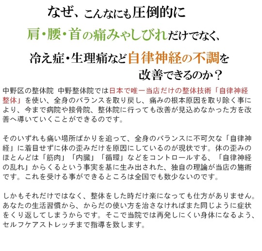 中野区沼袋の女性専門整体院|痛みと自律神経の専門家。頭痛、肩こり、腰痛、顎関節、更年期、産前産後、女性特有の慢性症状 あなたのお悩み聞かせて下さい