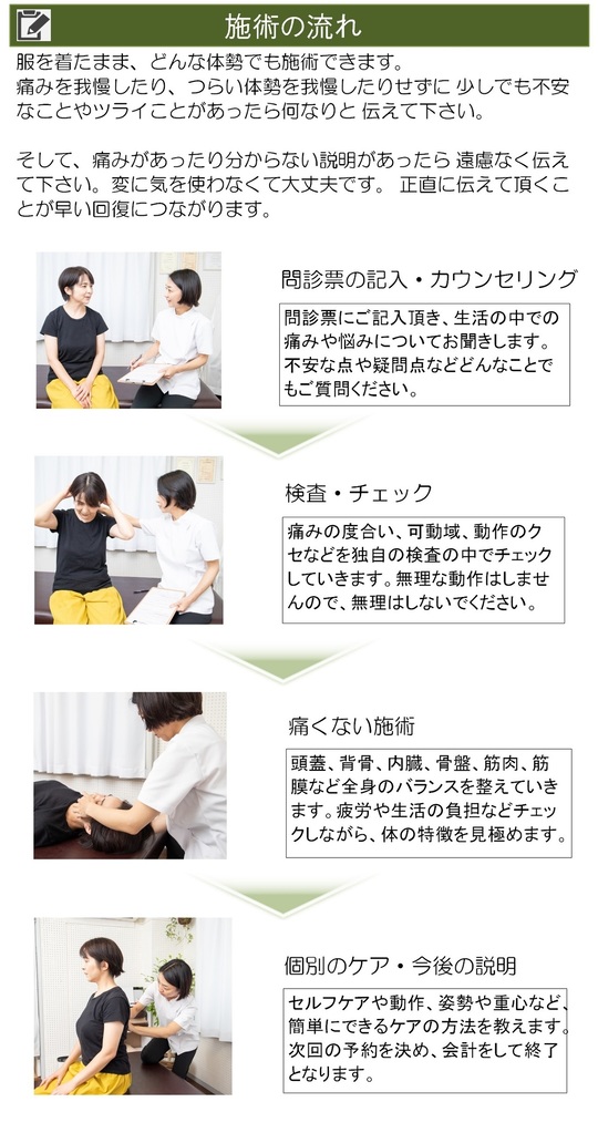 また、公認心理師の資格も持つ施術者による丁寧なカウンセリングで、心身の状態を確認し、ご自宅でできるセルフケアもお伝えし、あなたが「辛くない、痛くない」毎日を過ごせるよう、サポートしていきます。