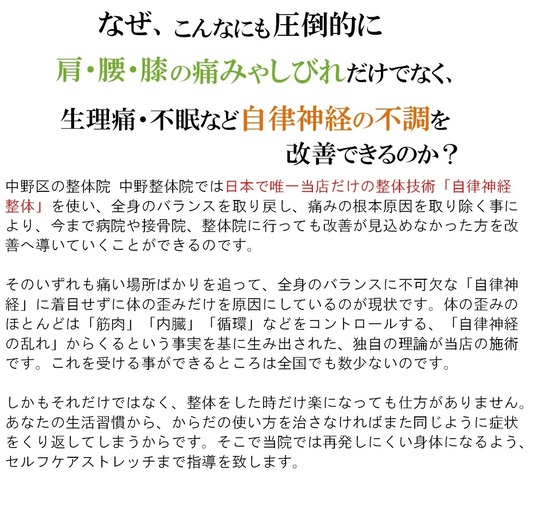 中野区沼袋の女性専門整体院|痛みと自律神経の専門家。頭痛、肩こり、腰痛、顎関節、更年期、産前産後、女性特有の慢性症状 あなたのお悩み聞かせて下さい