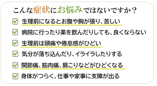 生理前になると、お腹の張りや頭痛、乳房の張りや痛み、腰痛などの症状が起きることはありませんか?