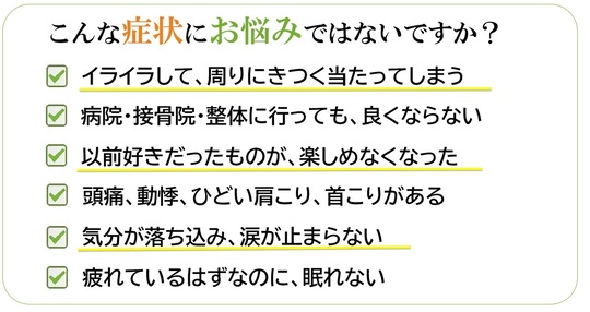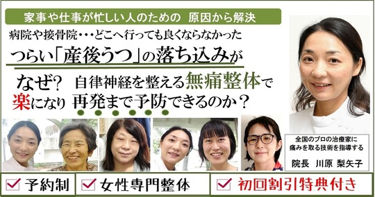 産後うつの方は、精神的な症状に加え、身体面の負担も強く、痛み、不調を抱えている方が多く見られます。