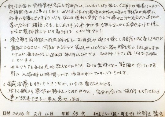Kさん、ご感想をありがとうございます。脊柱管狭窄症による腰の痛みで、いらっしゃった時には横になることも厳しい状態でしたね。最近では仰向けの施術もできるようになり、また、痛みが楽な日も増えてきて、本当に良かったです。腰がのび、姿勢も変わりましたね。介護の現場でお身体を使うお仕事なので、腰の負担を減らすのは大変ですが、毎日のセルフケアをしっかり行い、できるだけ負担のかからない姿勢を探すなど、Kさんの努力は素晴らしいです。お仕事が忙しかった時などは、まだ痛みがでることがありますが、適切なペースで施術を受け、セルフケアを続けていただくことで改善してくると思います。これからも、Kさんが痛みに悩まされず充実した毎日を送れるよう、サポートできれば幸いです。