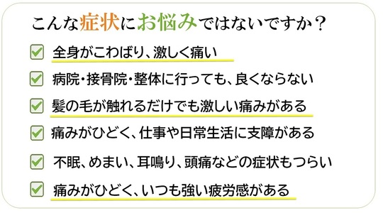 激しい痛みがあるのに、骨、筋肉、関節に異常が見つからないため、医療機関を転々とし、それによって精神的にも疲弊し、不眠やうつ症状などの自律神経症状、またそれによって引き起こされる身体症状を併発することが多くあります。