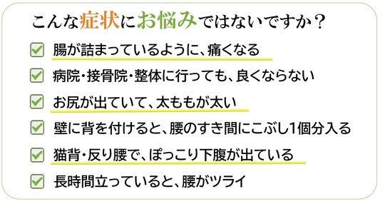 腰の痛みは、多くの場合、長い期間の負担が積み重なって起きています。そのため、施術により痛みが緩和されても、根本的に症状が改善するまでには、時間がかかることもあります。