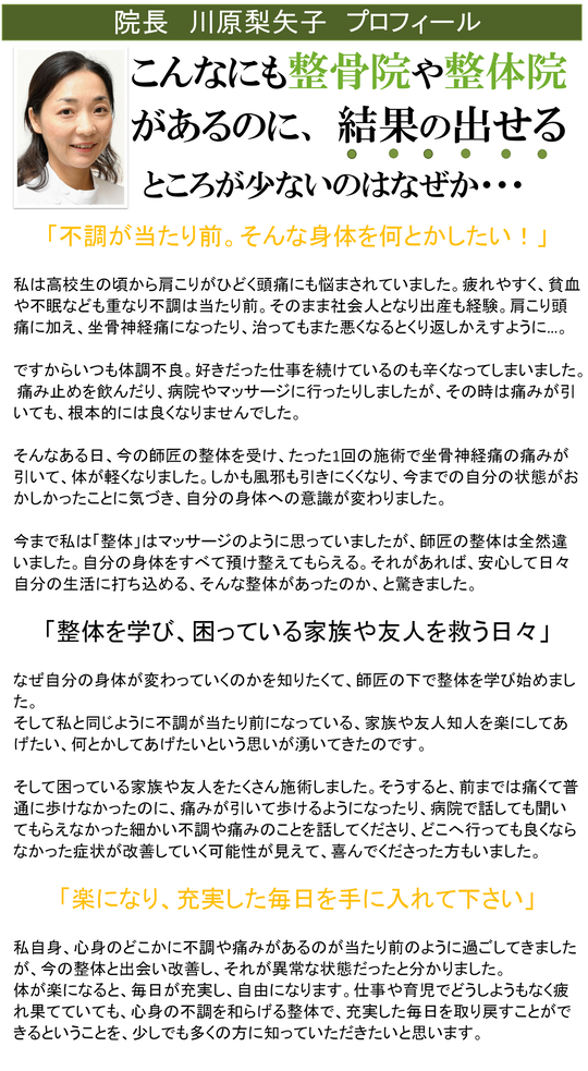中野区沼袋の女性専門整体院|痛みと自律神経の専門家。頭痛、肩こり、腰痛、顎関節、更年期、産前産後、女性特有の慢性症状 あなたのお悩み聞かせて下さい