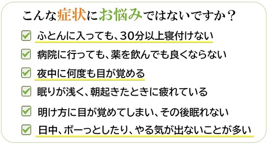 就寝、起床時間を一定にする、寝る前にカフェインをとらない、ストレス発散など、心がけ次第でできることもありますが、不眠の方の多くは、「やれることはやっているけれど、眠れない」と悩んでいます。