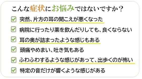 多くの場合、片耳だけに起こります。耳が聞こえにくいだけでなく、耳が詰まったような感じ(耳閉感)や耳鳴り、めまいを伴う場合もあります。