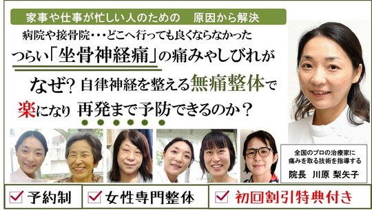 中野区沼袋の女性専門整体院|痛みと自律神経の専門家。頭痛、肩こり、腰痛、顎関節、更年期、産前産後、女性特有の慢性症状 あなたのお悩み聞かせて下さい