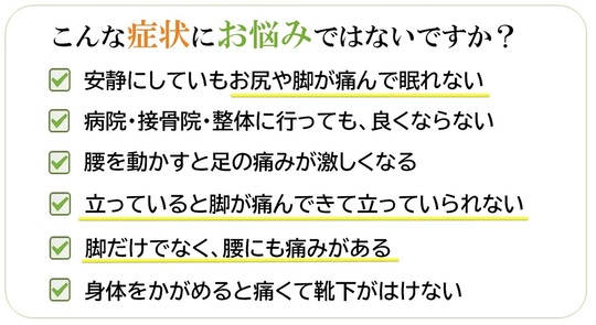 座骨神経痛は、腰から下肢にあらわれる痛みやしびれが続く状態の総称です。